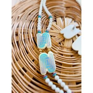 Add a touch of vintage charm to your jewelry collection with this delightful 1980s necklace and earring set! The ceramic white and turquoise combination exudes a playful and cheerful vibe. This set is perfect for adding a pop of color and fun to any outfit.