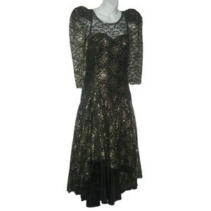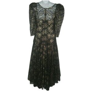 Vintage 80s Nem's Dress Gothic Black & Gold Metallic Lace Wedding Goth ALT egirl
