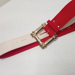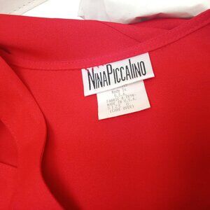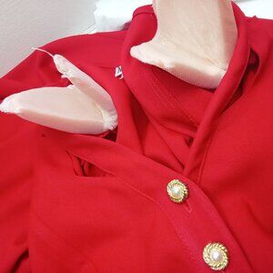 -- Nina Piccalino made in USA, Ladies -Medium (8), Pullover Step-in Midi Knee-length, Pencil Pleated, faux pearl Button-up bodice, Power shoulder pads, yoke elastic-waist with Belt loops, skirt back kick-pleat, gold-tone square buckle 32" belt, pockets, Solid pattern, lightweight material, dry clean , Acetate 80% Nylon 20% fabric, in bright bold Red and gold-tone colorway.