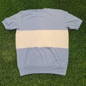 Vintage 80s Nutmeg Mills Carolina short sleeve sweatshirt light blue and white color block script logo UNC Tar Heels USA made retro top