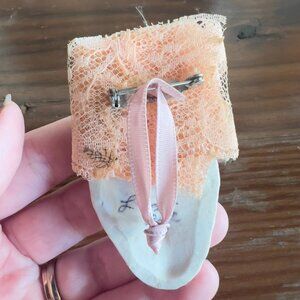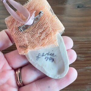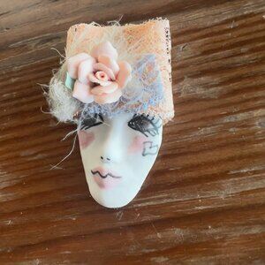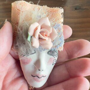 Vintage circa 1980s ceramic face brooch pin pendant with lace and ceramic rose details. Hand painted face. Signed on the back. In excellent condition with no known flaws.