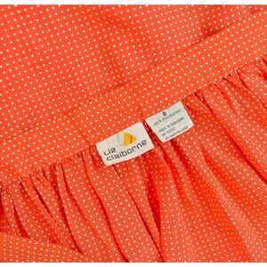 Vintage 1980's orange and off-white polka dot skirt. Lightweight silky fabric. High waisted. Full silhouette. Side pockets. Midi length. Buttons at side waist. Unlined.