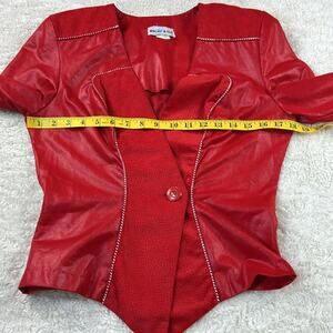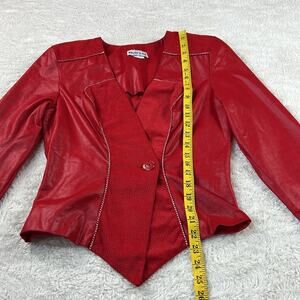 Fitted blazer in cherry red features faux leather and faux suede panels with shoulder pads and one gold button closure. Tuxedo vest style hem, which a nipped in waist for a fetching silhouette. Made in the USA. Marks on inside lapel, see last picture. They do not show when worn.