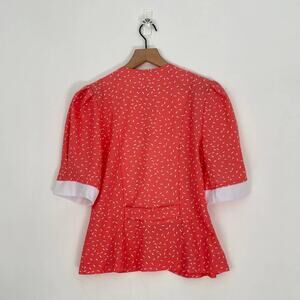 This TF top features a wrap style with a single button in the middle, short wide sleeves, a plunge neck and white hems and speckles. Wear this top casually, dress up a vintage style outfit. Sie tag is faded, but the blouse measures like a small.