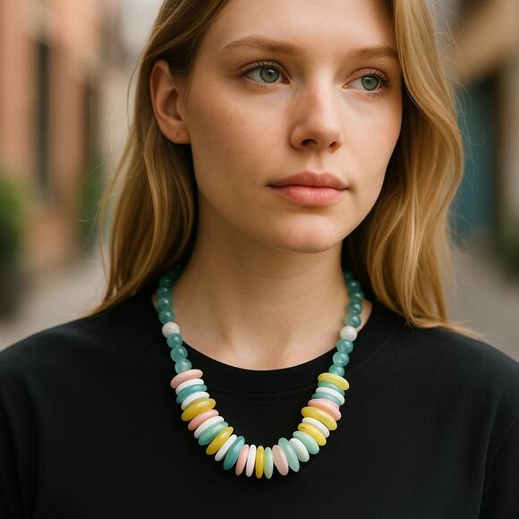 Vintage 80s Pastel Beaded Disc Statement Necklace Translucent Acrylic