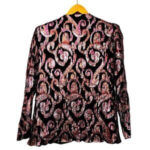 Step back in time with this fabulous vintage 1980's Patra Petites top! Fully lined, it features a dazzling pink, gold, and red metallic swirl pattern that's sure to turn heads. The wrap style design and 3-button shoulder detail add a touch of sophistication.