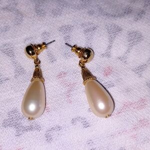 Vintage 80s Pearl Shaped Gold Pierced Post Dangle Earrings
