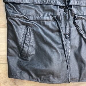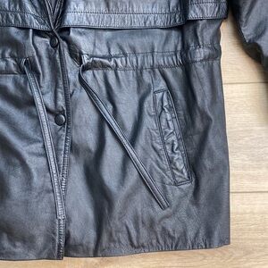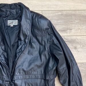 Amazing Genuine black leather Jacket by Pellé Studio. Complete with padded raglan shoulders and a drawstring waist this is must have 80's outerwear for winter! The drawstring waist gives a peplum silhouette if desired. Shawl collar and two snap closure for easy on and off. One small scuff on the back as pictured, overall in excellent condition. Women's size Large L