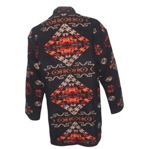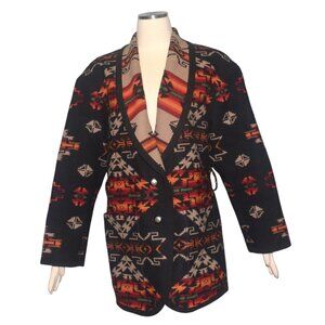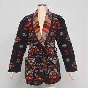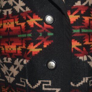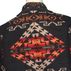 Beautiful jacket from Pendleton! Dark charcoal background, almost black with colorful southwest design. Two buttons center front and matching tie belt. Pockets at bottom of front. Size medium. Bust approx. 45, length approx. 30.5 inches. Fabric has some very minor pilling. One small worn area, not noticeable see closeup photo. Some minor wear to inside of sleeve cuff trim. Nothing that detracts from overall appearance, presents beautifully.