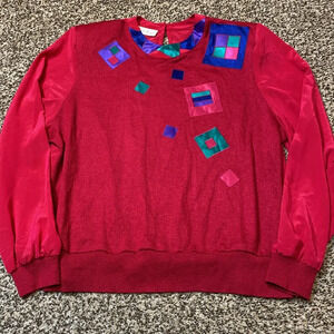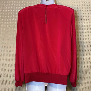 Vintage size 16. Pit to pit 23”. Shoulder to hem 24”. Has shoulder pads that could easily be cut out. Excellent condition, one small spot on right arm (pictured). Mixed fabrics, lightweight knit & silky.
