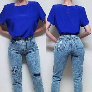 Vintage 80s Pia Rucci Royal Blue Silk Short Sleeve Crewneck Boxy Blouse.