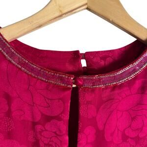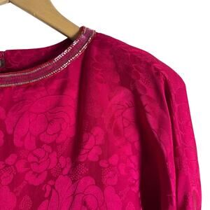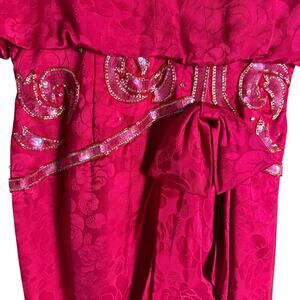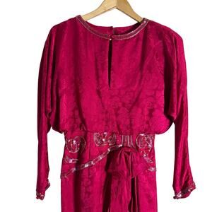 Vintage 80s Pink Sequin Beaded Ruffled Jacquard Long Sleeve Cocktail Dress 6