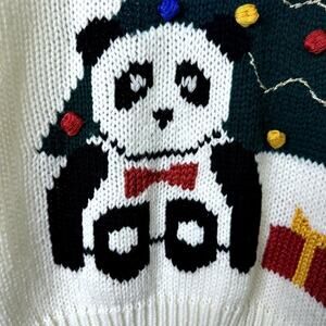 Loose knit pullover crew neck Christmas Sweater featuring a Christmas tree with baubles and gold garland, a panda bear and wrapped gifts. Cream sweater with green tree, black and white panda, yellow blue and red gifts. Vintage size, so it runs a bit small. Please check the measurements below to ensure fit.