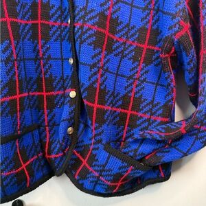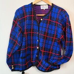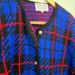 Cozy meets classic 80s bold in this vintage knit button-up sweater from Tally-Ho. Featuring a timeless blue, black, and red plaid design, structured shoulder pads, buttoned cuffs, and handy front pockets, this piece is everything retro dreams are made of.
