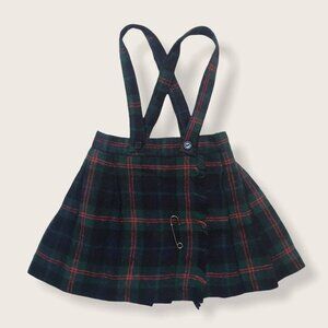Vintage 80s Plaid Wool Kilt Overalls Dress Green Blue Size 2