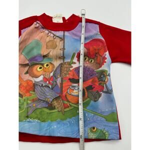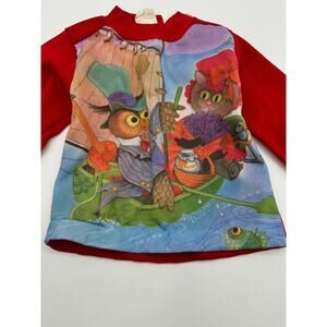 Vintage 80s baby sweatshirt featuring a colorful owl-themed graphic on the front with vibrant red sleeves, collar, and cuffs. Made in Hong Kong by Playtown, tagged size 12 months. Soft fabric with ribbed trim for a cozy fit. A rare and collectible piece, perfect for vintage baby clothing enthusiasts. Shows some signs of age, adding to its nostalgic charm.
