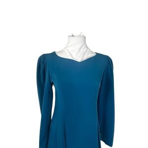 Excellent Vintage Condition. Great sof teal midi dress with poof sleeves. No label. Dress sits up the back poo sleeves fit and flare midi dress bust 34 weighs 28 hips 46 length 41.