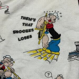 Unique handmade 1980s Popeye sweatshirt featuring an all-over print. Ribbed red collar, cuffs, and waistband. Likely a one-off or small-batch handmade piece using licensed Popeye yardage, giving it a distinctive cottage-style construction.
