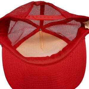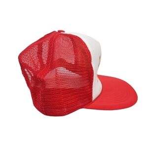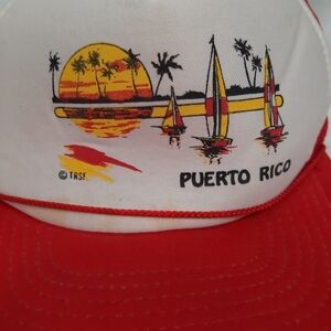 Features foam front with Puerto Rico graphic, red twisted rope around brim, flat brim, plastic snapback, one size fits all, red trucker mesh back, vintage 1980s baseball hat, trucker hat.