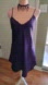 All shiny dark purple satin, with a dark purple floral rose applique accent. Sleeveless, with thin spaghetti straps. V neckline. Curved hemline, giving sexy side slits. Mini length. 100% Polyester