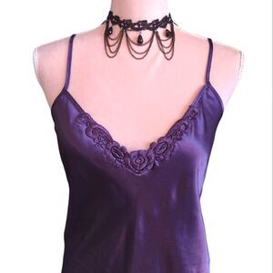 Vintage 80s Purple Satin Floral Applique Chemise Mini Slip Dress Medium