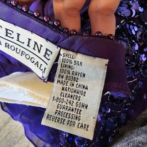 Make a statement in this vintage 80s cocktail dress. The purple silk fabric is adorned with intricate beading, adding a touch of elegance to the long-sleeved design. Perfect for any special occasion, this dress is sure to turn heads. The beaded details make it a unique piece that will stand out in a sea of ordinary dresses. The color is rich and vibrant, making it a great choice for any skin tone. This dress is a vintage gem that will never go out of style.