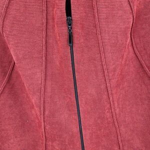 Bold brick red Vintage 80's R&K Originals collarless blazer features a unique textured starburst design and a zip closure. A striking alternative look, perfect for those seeking to make a statement.