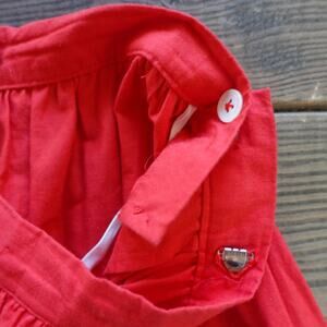 Features: Gathered waistband; side button and hook-and-eye closure; full tiered silhouette with ruffle/pintuck detailing near hem; lightweight woven cotton