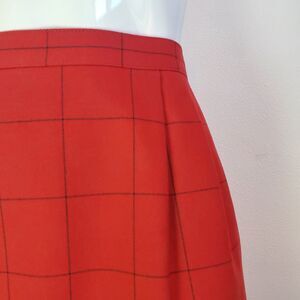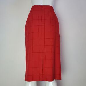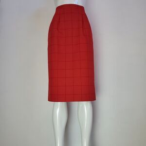 Vintage red and black windowpane plaid knee-length pencil skirt. High-waisted with front-pleating, 2 hip pockets, button and zipper closure in back, back kick pleat, and inner lining.