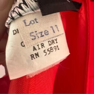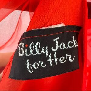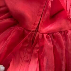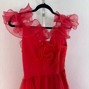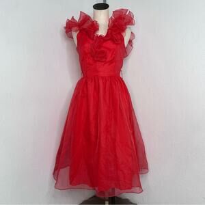 Stunning vintage red organza party dress with dramatic ruffle trim at the neckline and shoulders. Features a fitted bodice, full gathered skirt, and a soft, floaty overlay. Union made in the USA