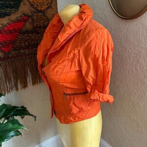 Vintage 1980s Renfrew Collection women's jacket in a bold bright orange with a unique puff collar design. Made in the USA and lined with a vibrant island-themed fabric. Fabric content is not labeled but appears to be a lightweight polyester blend. A standout piece perfect for lovers of retro fashion and statement outerwear.