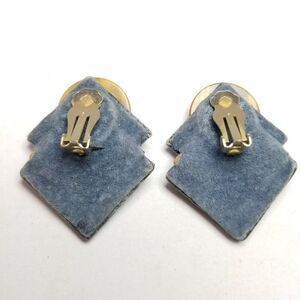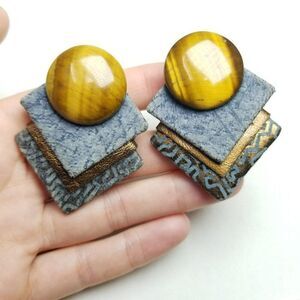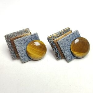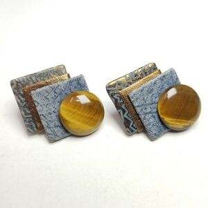 Vintage 80s Retro Layered Mixed Material Clip On Earrings, Square, Cabochon