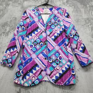 Vintage 80s Rickie Freeman Teri Jon Skirt Suit Size 12 Silk Sequin Jacket Pencil Straight Cut Geometric Purple Pink Blue Black Cream Jewel Rhinestone Gem Buttons Safety Snap Padded Shoulders Lined Collarless Side Zip Skirt Back Elastic Waist Back Slit Office Career Preppy Formal Event Occasion Mother of the Bride Party