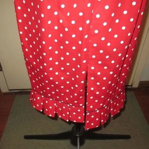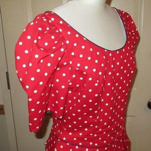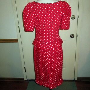 Vintage 80's Roberto Dei Como Italy Red White Polka Dot Dress sz 8 EUC. Adorable vintage dress with box pleat detail around the waist and hem. Embellished with navy blue piping. The dress is unlined and has a slit in the back. Closes with a back zipper.