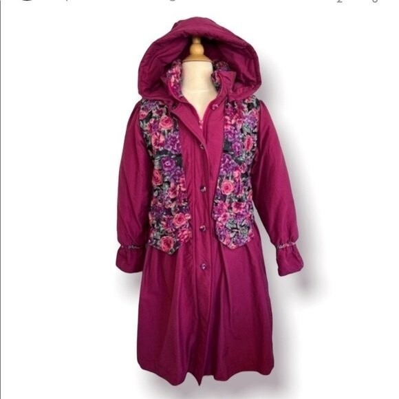Amazing 1980s Vintage Magenta Pink Floral Long Puffer Coat by Rothschild. Bold magenta color with purple, green and pink floral accents. Removable hood is attached with buttons. Full length zippered front with button placket. Attached floral vest with pockets gives off homeschool mom vibes. Good vintage condition. Some light staining and disfigurement to the lining (see photos). Doesn't affect function and not visible when worn.