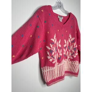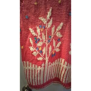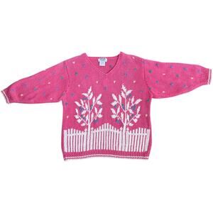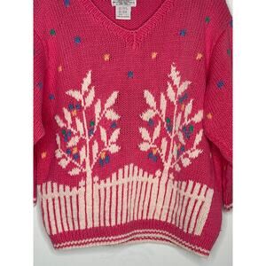 Charming vintage 1980s SKYR Sportswear sweater featuring a-pink knit with a cream tree and fence design and colorful confetti stitching throughout. Made from a soft ramie-cotton blend (55% ramie, 45% cotton) for a textured, breathable feel. V-neck, relaxed fit, and cropped length make it perfect for layering or a cozy statement look. Made in Hong Kong. Playful, artsy, and quintessentially 80s cottagecore.