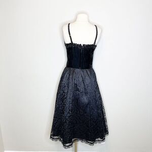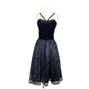 Vintage 80s S/M Black Velvet Lace Formal Dress Sequin Halter Tulle Midi Prom