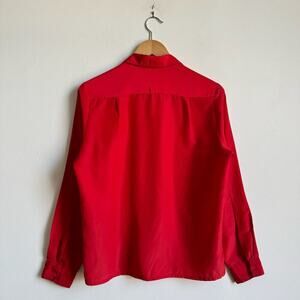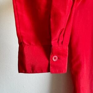 Details: Vintage 1980's red button-down blouse with notched collar. Light no wrinkle fabric. Great retro yet classic blouse that could work well for workwear/office attire, everyday, or an evening look with a bright pop of red!