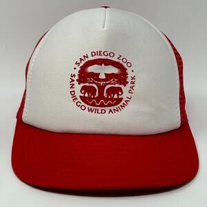 Vintage 80s San Diego Zoo Trucker Hat Baseball Cap Wild Animal Park California Mesh Snapback Foam Front 5 Panel A-Frame Red