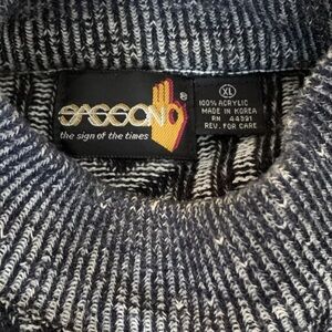 This is a Vintage 1980s Sassoon men's sweater in size XL. The sweater features a black and white geometric pattern, giving it a unique and stylish look. Made of acrylic material, this original piece from Korea is perfect for casual occasions. The sweater is a great addition to any vintage clothing collection, showcasing the fashion trends of the 1980s with a modern twist. Please see photos for condition as this Cosby style sweater is pre-owned.