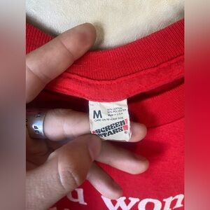 Bright red tee with bold graphic. Comfortable and stylish. Fuddruckers used to be the place to be! I believe it was part of the uniform sometime in the early 80s. Graphic says “ You wont believe how big it is at Fuddruckers”