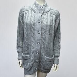 Gorgeous vintage cable knit cardigan from Sears, circa 1980s. Features classic cable knit pattern throughout with ribbed collar, cuffs, and hem. Front button closure with 8 matching gray buttons. Two functional patch pockets at hip. Note: Has three small spots (as disclosed in photos) - priced accordingly. Otherwise in good vintage condition.