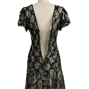 Vintage Sequin Dress Black Gold Floral Lace Size Small by Huet Young for HW Collection Formal with flutter sleeves, zipper and hook and eye closures at back, gold metallic floral lace overlay, dropped waist, flowy skirt, bodice has floral