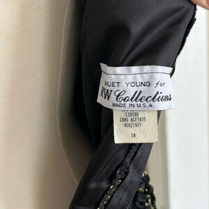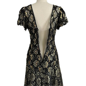 Vintage Sequin Dress Black Gold Floral Lace Size Small by Huet Young for HW Collection Formal with flutter sleeves, zipper and hook and eye closures at back, gold metallic floral lace overlay, dropped waist, flowy skirt, bodice has floral