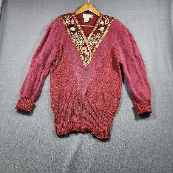 Vintage 80s Shannan Womens Sweater Large Angora Wool Garnet Red Sequin Beaded