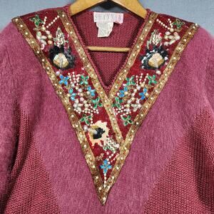 Vintage 80s Shannan Womens Sweater Large Angora Wool Blend Garnet Red Sequin Beaded Dynasty Fuzzy Embellished Made in Hong Kong
