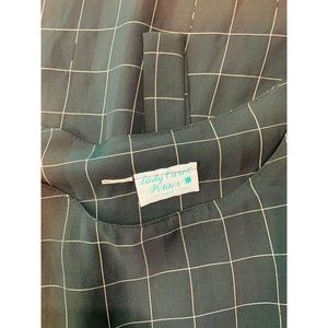 A vintage 1980s sheer black dress with a white windowpane geometric print that ties at the side elastic waist.