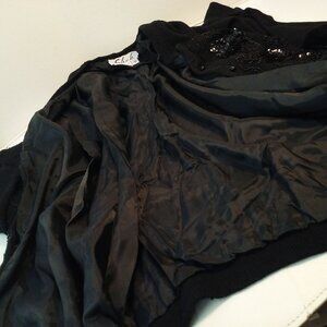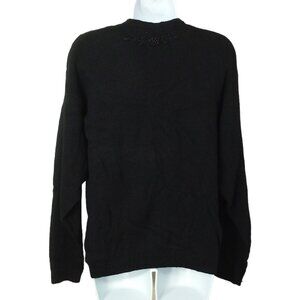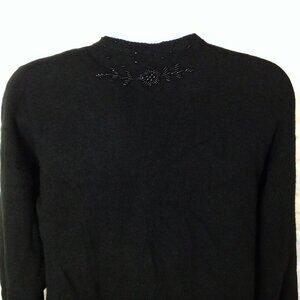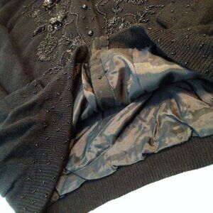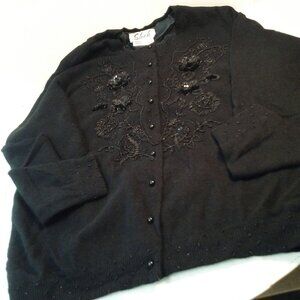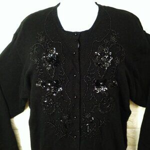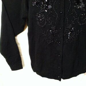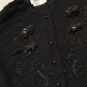 -- Shek made in Hong Kong, Ladies-marked 42/M measures XL(16), Floral Embellished Embroidered Beaded Sequins, crewneck, boxy blouson, drop shoulder Long Sleeves, Buttons-Up closure, Lined, dry clean, fine knit 70% Lambs Wool 20% Angora Rabbit 10% nylon, in dark neutral black colorway.