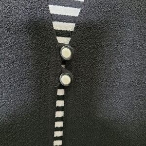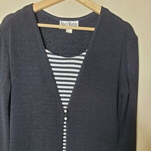 This vintage Sheri Martin dress delivers serious retro drama with its structured look—but it’s all one piece. The black body is accented by an attached black-and-white striped panel that gives the illusion of a cropped jacket layered over a sleek dress. Two cute buttons complete the throwback charm.