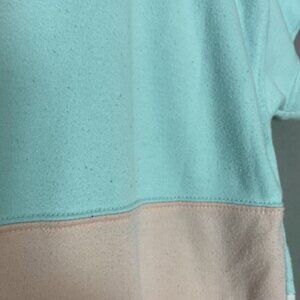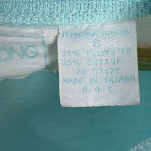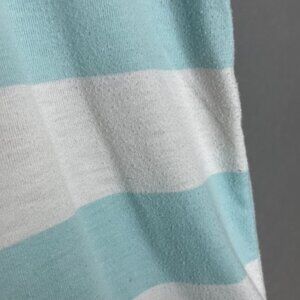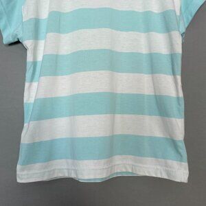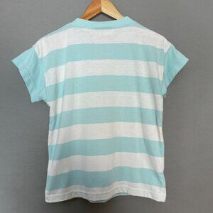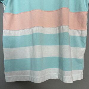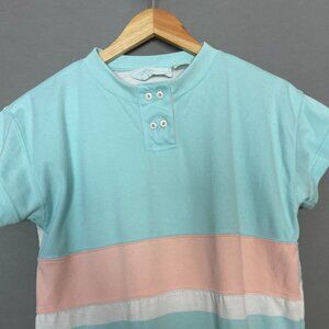 Vintage Goola Gong 1980s short sleeve striped top in white, pastel blue and a peachy pink color. Four buttons at the collar.